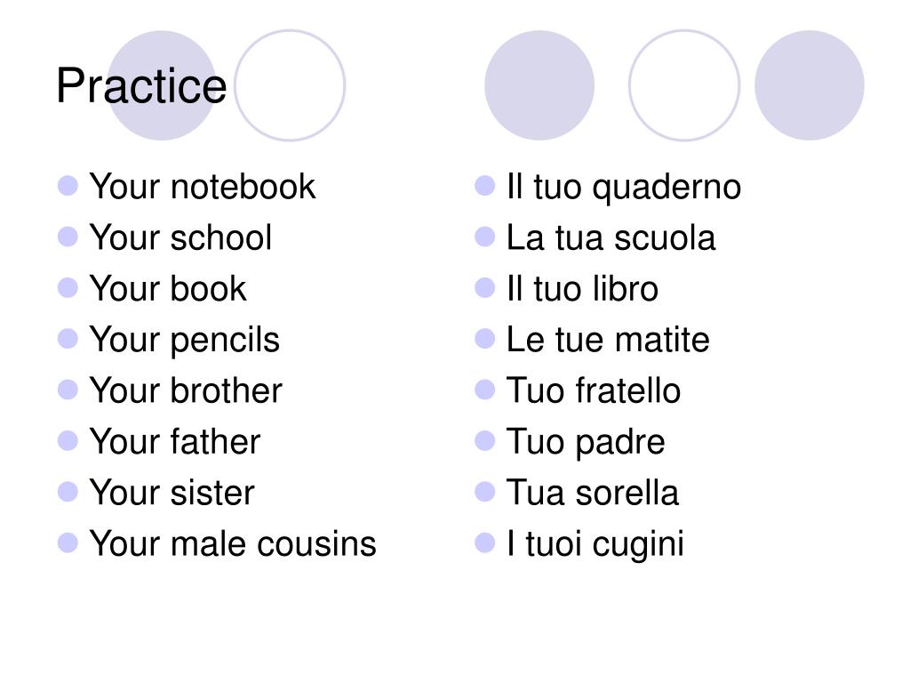 Your notebook Your school Your book Your pencils Your brother Your father Your sister Your male cousins Il tuo quaderno La tua scuola Il tuo libro Le tue matite Tuo fratello Tuo padre Tua sorella I tuoi cugini Practice