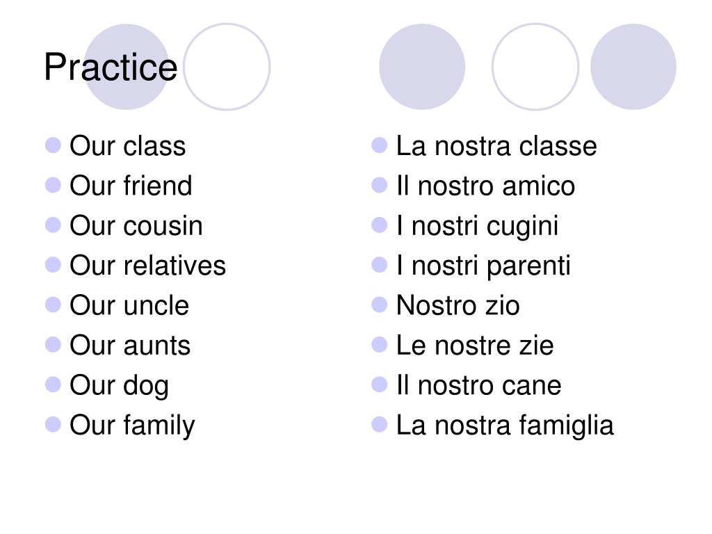 Our class Our friend Our cousin Our relatives Our uncle Our aunts Our dog Our family La nostra classe Il nostro amico I nostri cugini I nostri parenti Nostro zio Le nostre zie Il nostro cane La nostra famiglia Practice