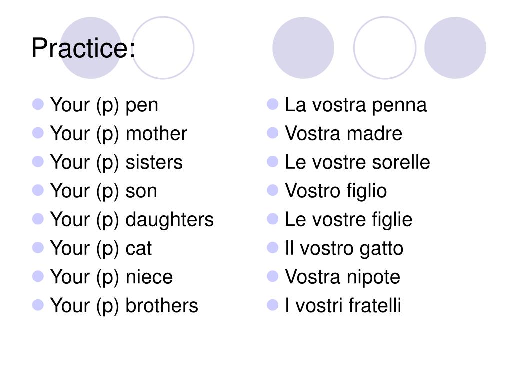 Your (p) pen Your (p) mother Your (p) sisters Your (p) son Your (p) daughters Your (p) cat Your (p) niece Your (p) brothers La vostra penna Vostra madre Le vostre sorelle Vostro figlio Le vostre figlie Il vostro gatto Vostra nipote I vostri fratelli Practice: