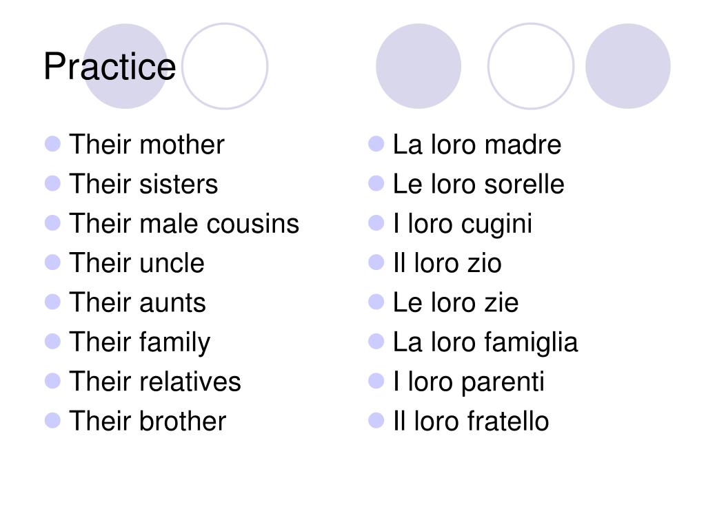 Their mother Their sisters Their male cousins Their uncle Their aunts Their family Their relatives Their brother La loro madre Le loro sorelle I loro cugini Il loro zio Le loro zie La loro famiglia I loro parenti Il loro fratello Practice