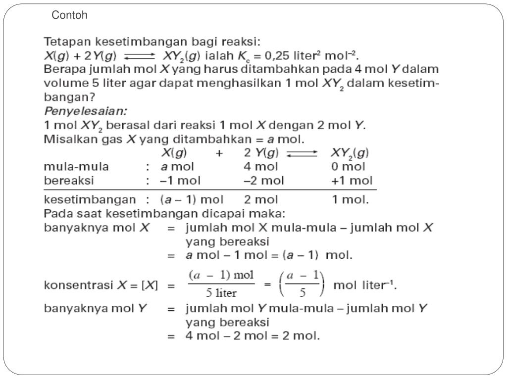 E. HubunganKuantitatifantaraPereaksidanHasilReaksidariSuatuReaksiKesetimbangan 1. Tetapan Kesetimbangan yang Dinyatakan sebagai Konsentrasi Molar ( Kc) Hubungankuantitatifantarazatpereaksidanzathasilreaksidapatdinyatakansebagai konsentrasi molar. Karena sebagian besar reaksi kimia terjadi dalam larutan, perbandinganbanyaknyazathasilreaksidanbanyaknyazatpereaksipadasaatkesetimbangandinyatakansebagaiKc