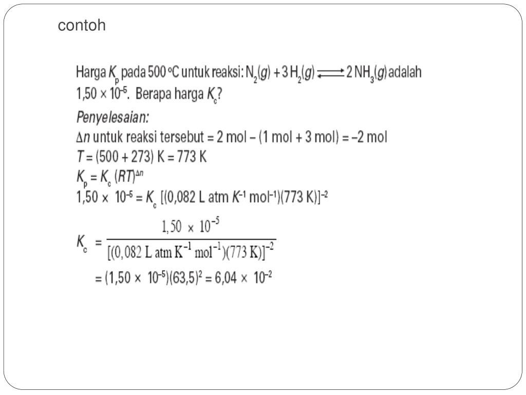 2. Tetapan Kesetimbangan yang Dinyatakan sebagaiTekananParsial ( Kp) • Untukkesetimbangan yang melibatkanfase gas, tetapankesetimbanganseringdinyatakansebagaitekananparsial, Kp. Padasaat gas terdiriatascampuranberbagai gas, tekanan total gas merupakanjumlahtekananmasing-masing gas penyusun. Contohnya, udaraterdiriatas nitrogen, oksigen, karbondioksida, argon, danuap air bertekanan 760 mmHg. Tekanan total (760 mmHg) tersebutmerupakan jumlah tekanan masing-masing gas penyusunnya. • Tekananparsialsuatu gas berhubungandengan mol gas, volume gas, dantemperatur absolut sesuai dengan persamaan gas ideal. • P = tekanan (atm) • V = volume (L) • n = mol (Massa/Mr) • R = tetapan gas umum (0,082 L atm K–1 mol–1)