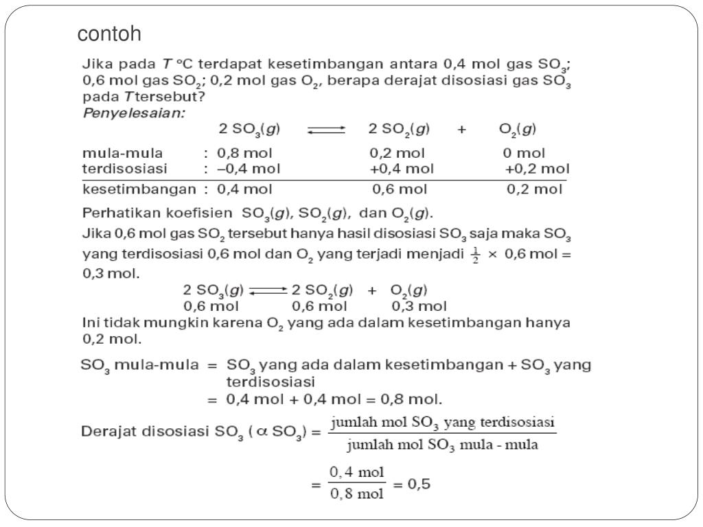F. KesetimbanganDisosiasi • Disosiasiadalahpenguraiansuatuzatmenjadibeberapazat lain. Dalamdisosiasijugaterdapatkesetimbangan (baikhomogenmaupunheterogen). Contoh: 2 NH3(g) N2(g) + 3 H2(g) (homogen) CaCO3(s) CaO(s) + CO2(g) (heterogen) Untukmenyatakanperbandinganantarabanyaknyazat-zat yang teruraidenganbanyaknyazatmula-mula, dipakaiistilahderajatdisosiasi yang diberilambangalfa ( α ). Banyaknyazat yang terurai = α × banyaknyazatmula-mula.