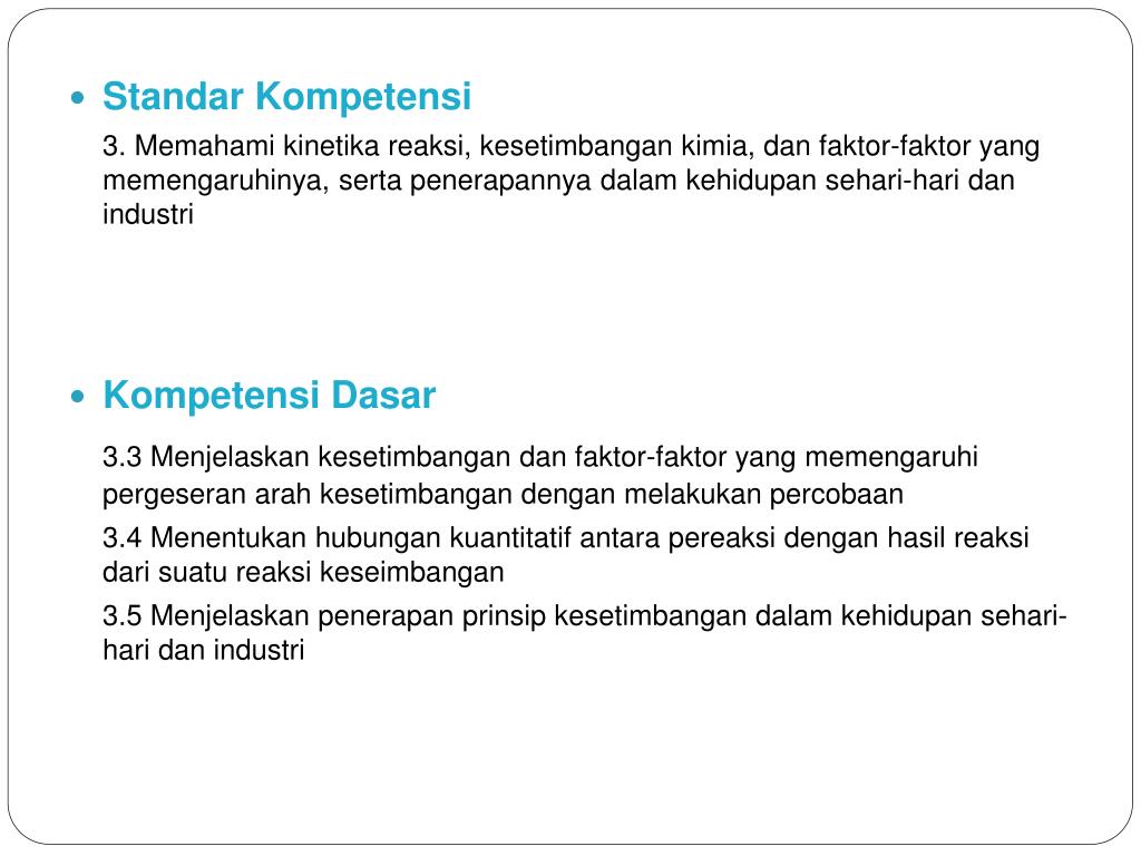 StandarKompetensi 3. Memahamikinetikareaksi, kesetimbangankimia, danfaktor-faktor yang memengaruhinya, sertapenerapannyadalamkehidupansehari-haridanindustri • KompetensiDasar 3.3 Menjelaskankesetimbangandanfaktor-faktor yang memengaruhipergeseranarahkesetimbangandenganmelakukanpercobaan 3.4 Menentukanhubungankuantitatifantarapereaksidenganhasilreaksidarisuatureaksikeseimbangan 3.5 Menjelaskanpenerapanprinsipkesetimbangandalamkehidupansehari-haridanindustri
