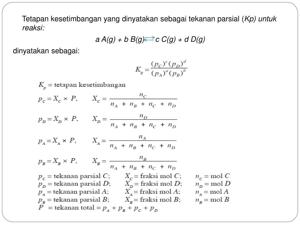 Tetapankesetimbangan yang dinyatakansebagaitekananparsial (Kp) untukreaksi: a A(g) + b B(g) c C(g) + d D(g) dinyatakansebagai: