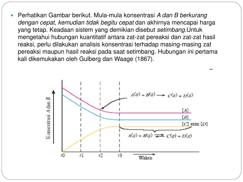 PerhatikanGambarberikut. Mula-mulakonsentrasiA danB berkurang dengan cepat, kemudian tidak begitu cepat danakhirnyamencapaiharga yang tetap. Keadaansistem yang demikiandisebutsetimbang.Untukmengetahuihubungankuantitatifantarazat-zatpereaksidanzat-zathasilreaksi, perludilakukananalisiskonsentrasiterhadapmasing-masingzatpereaksimaupunhasilreaksipadasaatsetimbang. Hubunganinipertama kali dikemukakan oleh Gulberg dan Waage (1867).