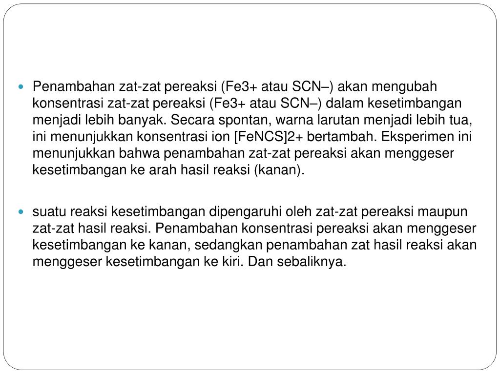 Penambahanzat-zatpereaksi (Fe3+ atau SCN–) akanmengubahkonsentrasizat-zatpereaksi (Fe3+ atau SCN–) dalamkesetimbanganmenjadilebihbanyak. Secaraspontan, warnalarutanmenjadilebihtua, inimenunjukkankonsentrasi ion [FeNCS]2+ bertambah. Eksperimeninimenunjukkanbahwapenambahanzat-zat pereaksi akan menggeser kesetimbangan ke arah hasil reaksi (kanan). • suatureaksikesetimbangandipengaruhiolehzat-zatpereaksimaupunzat-zathasilreaksi. Penambahankonsentrasipereaksiakanmenggeserkesetimbangankekanan, sedangkanpenambahanzathasilreaksiakanmenggeserkesetimbangankekiri. Dan sebaliknya.