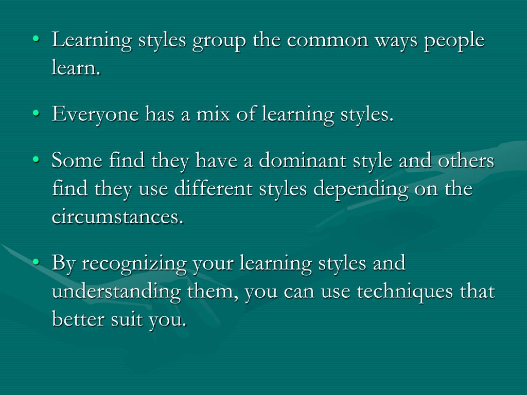Learning styles group the common ways people learn. • Everyone has a mix of learning styles. • Some find they have a dominant style and others find they use different styles depending on the circumstances. • By recognizing your learning styles and understanding them, you can use techniques that better suit you.