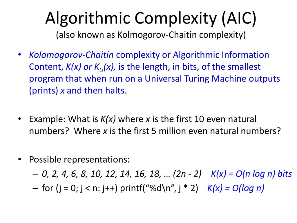 Algorithmic Complexity (AIC)(also known as Kolmogorov-Chaitin complexity) • Kolomogorov-Chaitin complexity or Algorithmic Information Content, K(x) or KU(x), is the length, in bits, of the smallest program that when run on a Universal Turing Machine outputs (prints) x and then halts. • Example: What is K(x) where xis the first 10 even natural numbers? Where xis the first 5 million even natural numbers? • Possible representations: • 0, 2, 4, 6, 8, 10, 12, 14, 16, 18, … (2n - 2) K(x) = O(n log n) bits • for (j = 0; j < n: j++) printf(“%d\n”, j * 2)K(x) = O(logn)