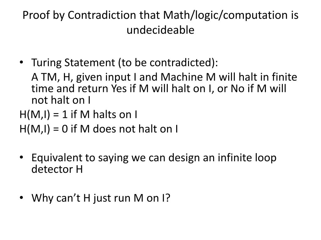 Proof by Contradiction that Math/logic/computation is undecideable • Turing Statement (to be contradicted): A TM, H, given input I and Machine M will halt in finite time and return Yes if M will halt on I, or No if M will not halt on I H(M,I) = 1 if M halts on I H(M,I) = 0 if M does not halt on I • Equivalent to saying we can design an infinite loop detector H • Why can’t H just run M on I?