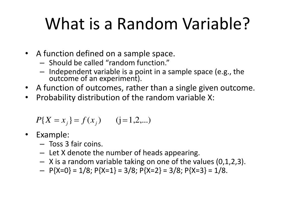 What is a Random Variable? • A function defined on a sample space. • Should be called “random function.” • Independent variable is a point in a sample space (e.g., the outcome of an experiment). • A function of outcomes, rather than a single given outcome. • Probability distribution of the random variable X: • Example: • Toss 3 fair coins. • Let X denote the number of heads appearing. • X is a random variable taking on one of the values (0,1,2,3). • P{X=0} = 1/8; P{X=1} = 3/8; P{X=2} = 3/8; P{X=3} = 1/8.