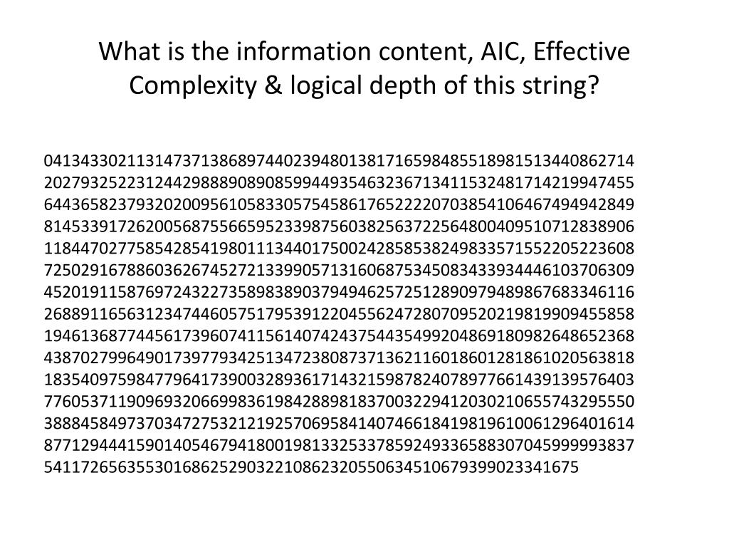What is the information content, AIC, Effective Complexity & logical depth of this string? 0413433021131473713868974402394801381716598485518981513440862714 2027932522312442988890890859944935463236713411532481714219947455 6443658237932020095610583305754586176522220703854106467494942849 8145339172620056875566595233987560382563722564800409510712838906 1184470277585428541980111344017500242858538249833571552205223608 7250291678860362674527213399057131606875345083433934446103706309 4520191158769724322735898389037949462572512890979489867683346116 2688911656312347446057517953912204556247280709520219819909455858 1946136877445617396074115614074243754435499204869180982648652368 4387027996490173977934251347238087371362116018601281861020563818 1835409759847796417390032893617143215987824078977661439139576403 7760537119096932066998361984288981837003229412030210655743295550 3888458497370347275321219257069584140746618419819610061296401614 8771294441590140546794180019813325337859249336588307045999993837 5411726563553016862529032210862320550634510679399023341675