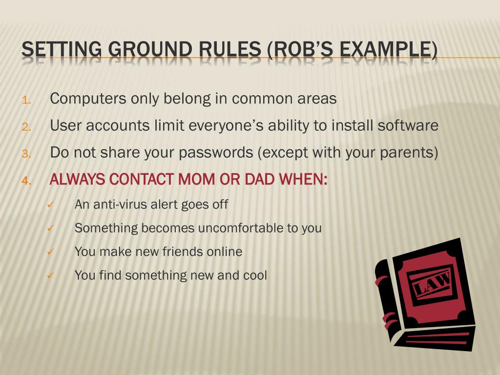 Computers only belong in common areas • User accounts limit everyone’s ability to install software • Do not share your passwords (except with your parents) • ALWAYS CONTACT MOM OR DAD WHEN: • An anti-virus alert goes off • Something becomes uncomfortable to you • You make new friends online • You find something new and cool Setting Ground rules (Rob’s Example)
