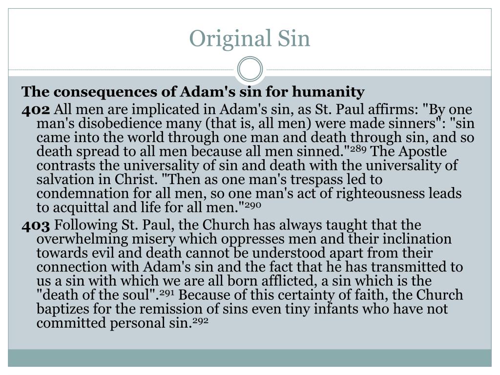 Original Sin The consequences of Adam's sin for humanity 402 All men are implicated in Adam's sin, as St. Paul affirms: "By one man's disobedience many (that is, all men) were made sinners": "sin came into the world through one man and death through sin, and so death spread to all men because all men sinned."289 The Apostle contrasts the universality of sin and death with the universality of salvation in Christ. "Then as one man's trespass led to condemnation for all men, so one man's act of righteousness leads to acquittal and life for all men."290 403 Following St. Paul, the Church has always taught that the overwhelming misery which oppresses men and their inclination towards evil and death cannot be understood apart from their connection with Adam's sin and the fact that he has transmitted to us a sin with which we are all born afflicted, a sin which is the "death of the soul".291 Because of this certainty of faith, the Church baptizes for the remission of sins even tiny infants who have not committed personal sin.292