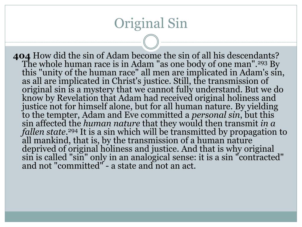 Original Sin 404 How did the sin of Adam become the sin of all his descendants? The whole human race is in Adam "as one body of one man".293 By this "unity of the human race" all men are implicated in Adam's sin, as all are implicated in Christ's justice. Still, the transmission of original sin is a mystery that we cannot fully understand. But we do know by Revelation that Adam had received original holiness and justice not for himself alone, but for all human nature. By yielding to the tempter, Adam and Eve committed a personal sin, but this sin affected the human nature that they would then transmit in a fallen state.294 It is a sin which will be transmitted by propagation to all mankind, that is, by the transmission of a human nature deprived of original holiness and justice. And that is why original sin is called "sin" only in an analogical sense: it is a sin "contracted" and not "committed" - a state and not an act.