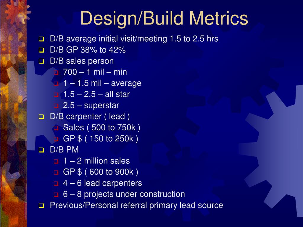 Design/Build Metrics • D/B average initial visit/meeting 1.5 to 2.5 hrs • D/B GP 38% to 42% • D/B sales person • 700 – 1 mil – min • 1 – 1.5 mil – average • 1.5 – 2.5 – all star • 2.5 – superstar • D/B carpenter ( lead ) • Sales ( 500 to 750k ) • GP $ ( 150 to 250k ) • D/B PM • 1 – 2 million sales • GP $ ( 600 to 900k ) • 4 – 6 lead carpenters • 6 – 8 projects under construction • Previous/Personal referral primary lead source