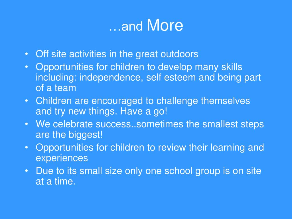 …and More • Off site activities in the great outdoors • Opportunities for children to develop many skills including: independence, self esteem and being part of a team • Children are encouraged to challenge themselves and try new things. Have a go! • We celebrate success..sometimes the smallest steps are the biggest! • Opportunities for children to review their learning and experiences • Due to its small size only one school group is on site at a time.