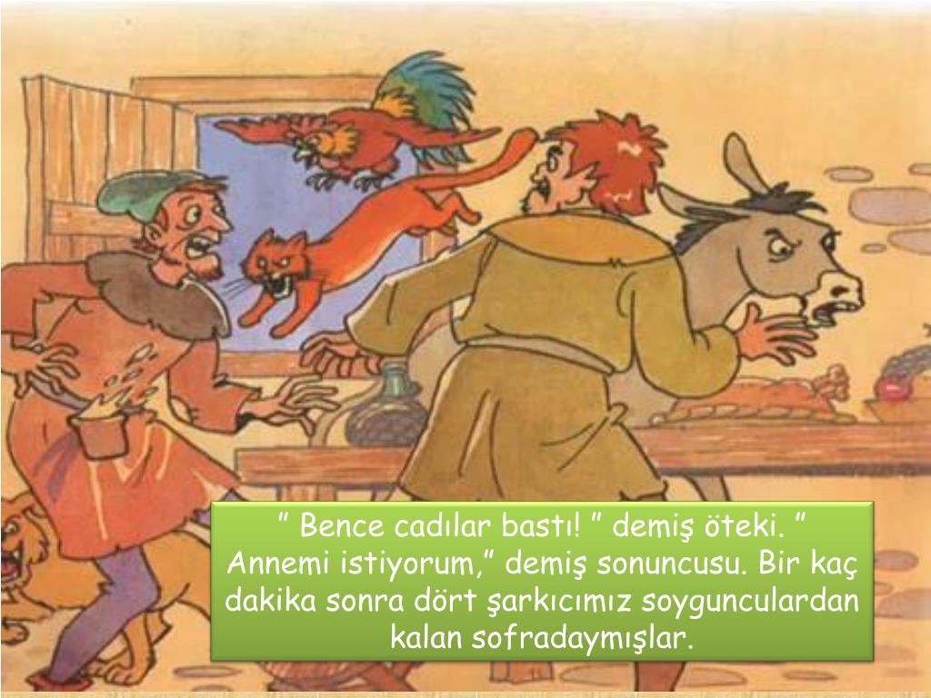 ” Bence cadılar bastı! ” demiş öteki. ” Annemi istiyorum,” demiş sonuncusu. Bir kaç dakika sonra dört şarkıcımız soygunculardan kalan sofradaymışlar.