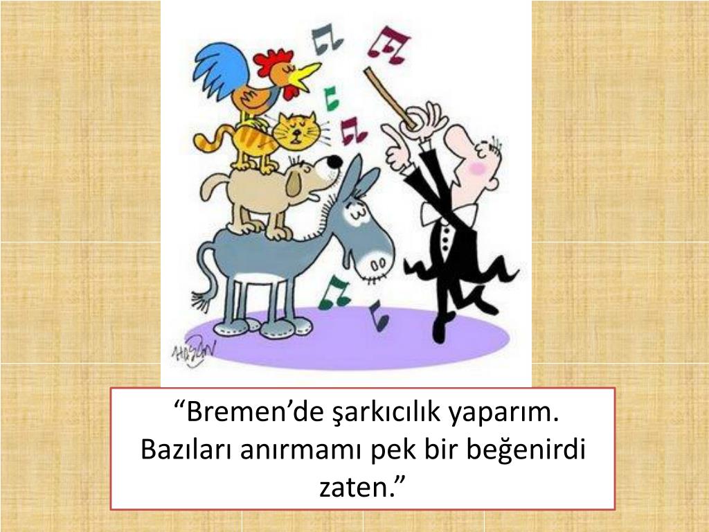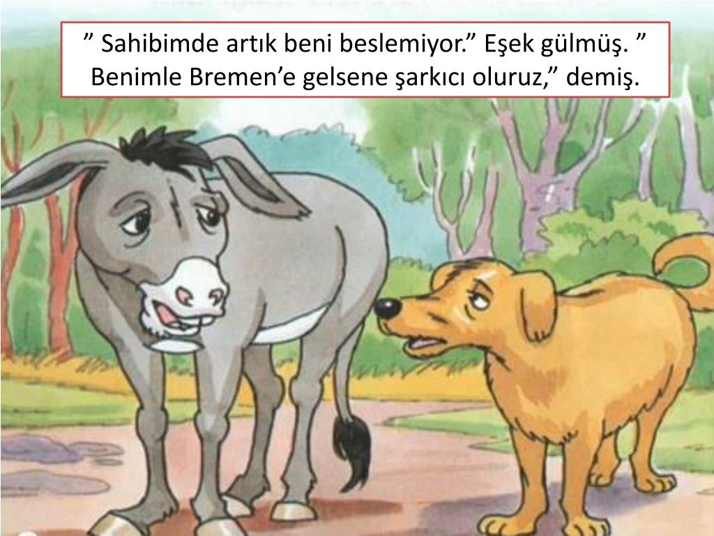 ” Sahibimde artık beni beslemiyor.” Eşek gülmüş. ” Benimle Bremen’e gelsene şarkıcı oluruz,” demiş.