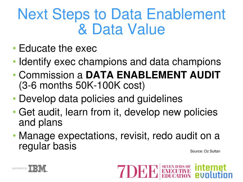 Next Steps to Data Enablement & Data Value • Educate the exec • Identify exec champions and data champions • Commission a DATA ENABLEMENT AUDIT (3-6 months 50K-100K cost) • Develop data policies and guidelines • Get audit, learn from it, develop new policies and plans • Manage expectations, revisit, redo audit on a regular basis Source: Oz Sultan