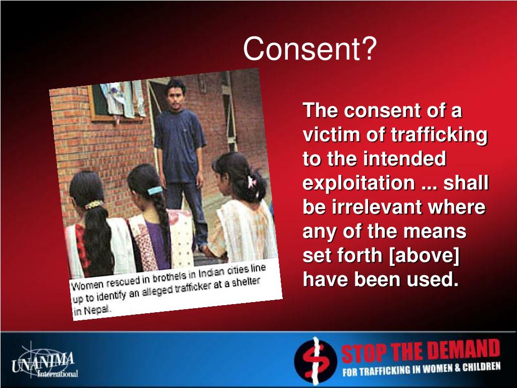 Consent? The consent of a victim of trafficking to the intended exploitation ... shall be irrelevant where any of the means set forth [above] have been used.