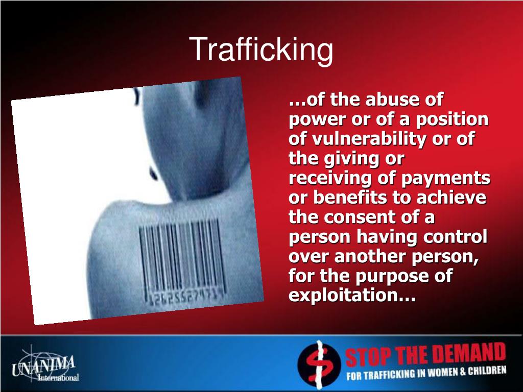 Trafficking • …of the abuse of power or of a position of vulnerability or of the giving or receiving of payments or benefits to achieve the consent of a person having control over another person, for the purpose of exploitation…