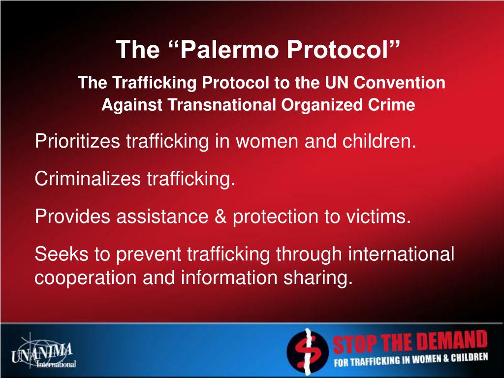 The “Palermo Protocol”The Trafficking Protocol to the UN Convention Against Transnational Organized Crime • Prioritizes trafficking in women and children. • Criminalizes trafficking. • Provides assistance & protection to victims. • Seeks to prevent trafficking through international cooperation and information sharing.