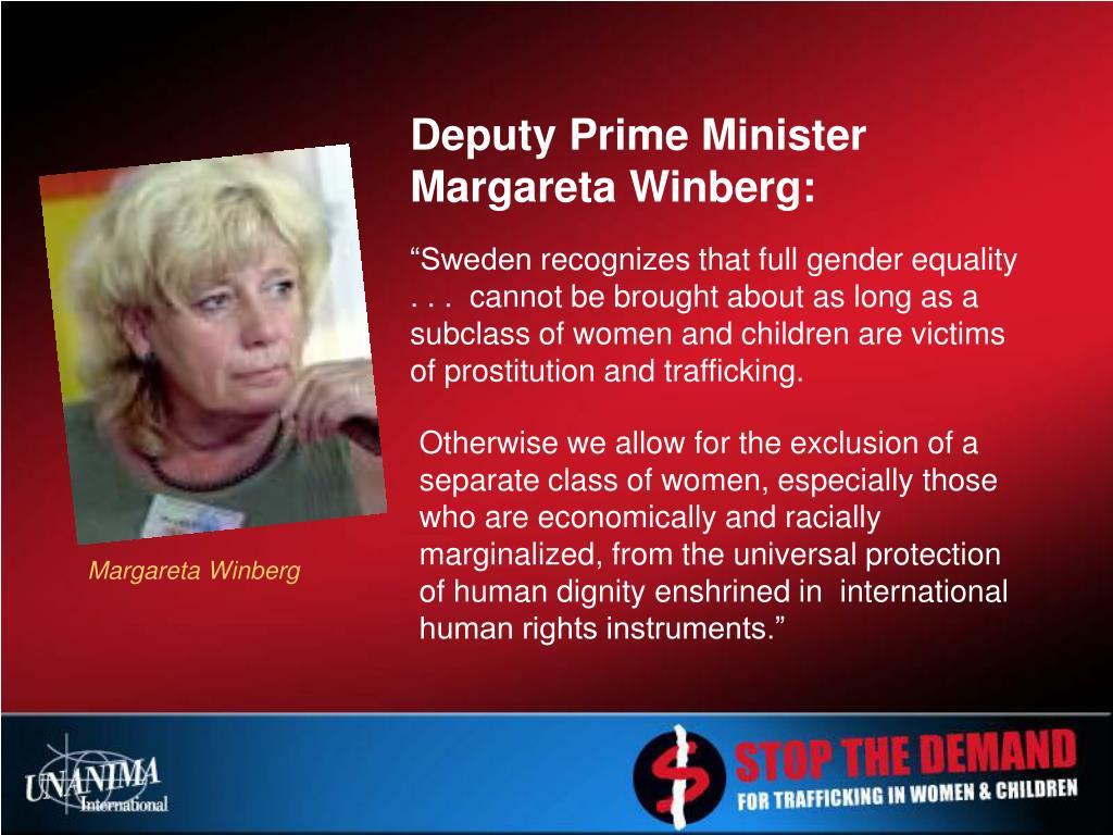 Deputy Prime MinisterMargareta Winberg: • “Swedenrecognizes that full gender equality . . . cannot be brought about as long as a subclass of women and children are victims of prostitution and trafficking. Otherwise we allow for the exclusion of a separate class of women, especially those who are economically and racially marginalized, from the universal protection of human dignity enshrined in international human rights instruments.” Margareta Winberg