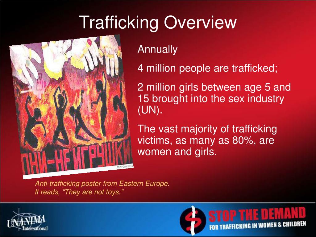 Annually 4 million people are trafficked; 2 million girls between age 5 and 15 brought into the sex industry (UN). The vast majority of trafficking victims, as many as 80%, are women and girls. Trafficking Overview Anti-trafficking poster from Eastern Europe.It reads, “They are not toys.”