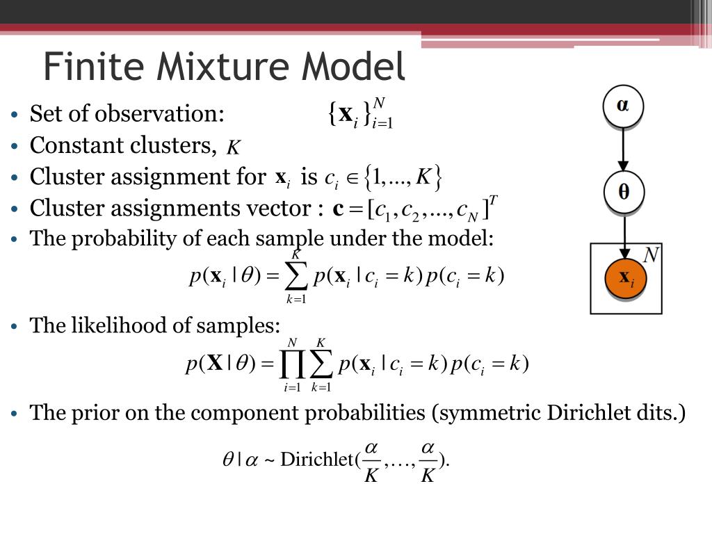 Finite Mixture Model • Set of observation: • Constant clusters, • Cluster assignment for is • Cluster assignments vector : • The probability of each sample under the model: • The likelihood of samples: • The prior on the component probabilities (symmetric Dirichletdits.)