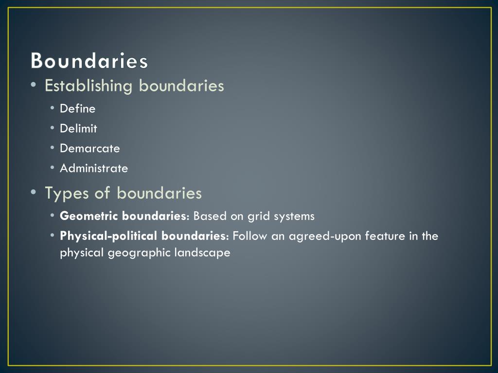 Boundaries • Establishing boundaries • Define • Delimit • Demarcate • Administrate • Types of boundaries • Geometric boundaries: Based on grid systems • Physical-political boundaries: Follow an agreed-upon feature in the physical geographic landscape