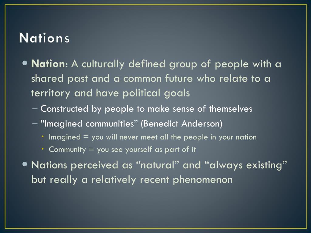 Nations • Nation: A culturally defined group of people with a shared past and a common future who relate to a territory and have political goals • Constructed by people to make sense of themselves • “Imagined communities” (Benedict Anderson) • Imagined = you will never meet all the people in your nation • Community = you see yourself as part of it • Nations perceived as “natural” and “always existing” but really a relatively recent phenomenon