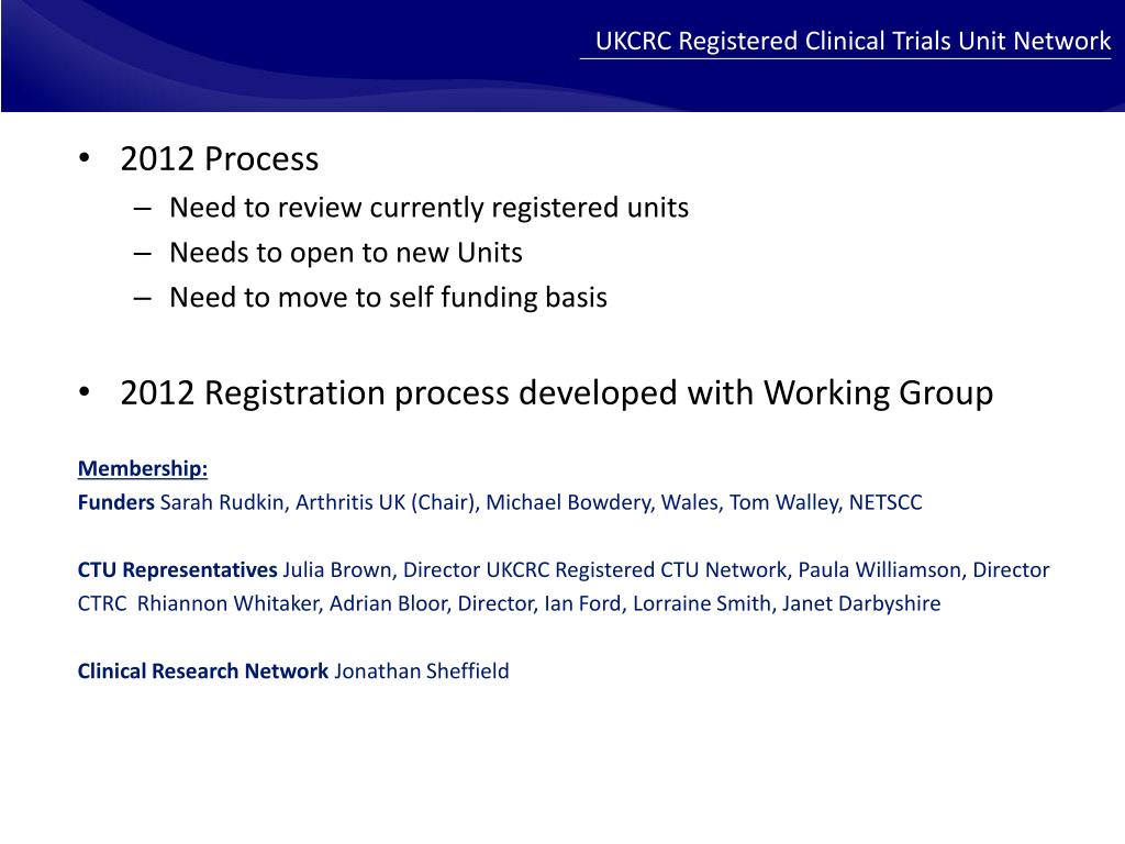 2012 Process • Need to review currently registered units • Needs to open to new Units • Need to move to self funding basis • 2012 Registration process developed with Working Group Membership: Funders Sarah Rudkin, Arthritis UK (Chair), Michael Bowdery, Wales, Tom Walley, NETSCC CTU Representatives Julia Brown, Director UKCRC Registered CTU Network, Paula Williamson, Director CTRC Rhiannon Whitaker, Adrian Bloor, Director, Ian Ford, Lorraine Smith, Janet Darbyshire Clinical Research Network Jonathan Sheffield