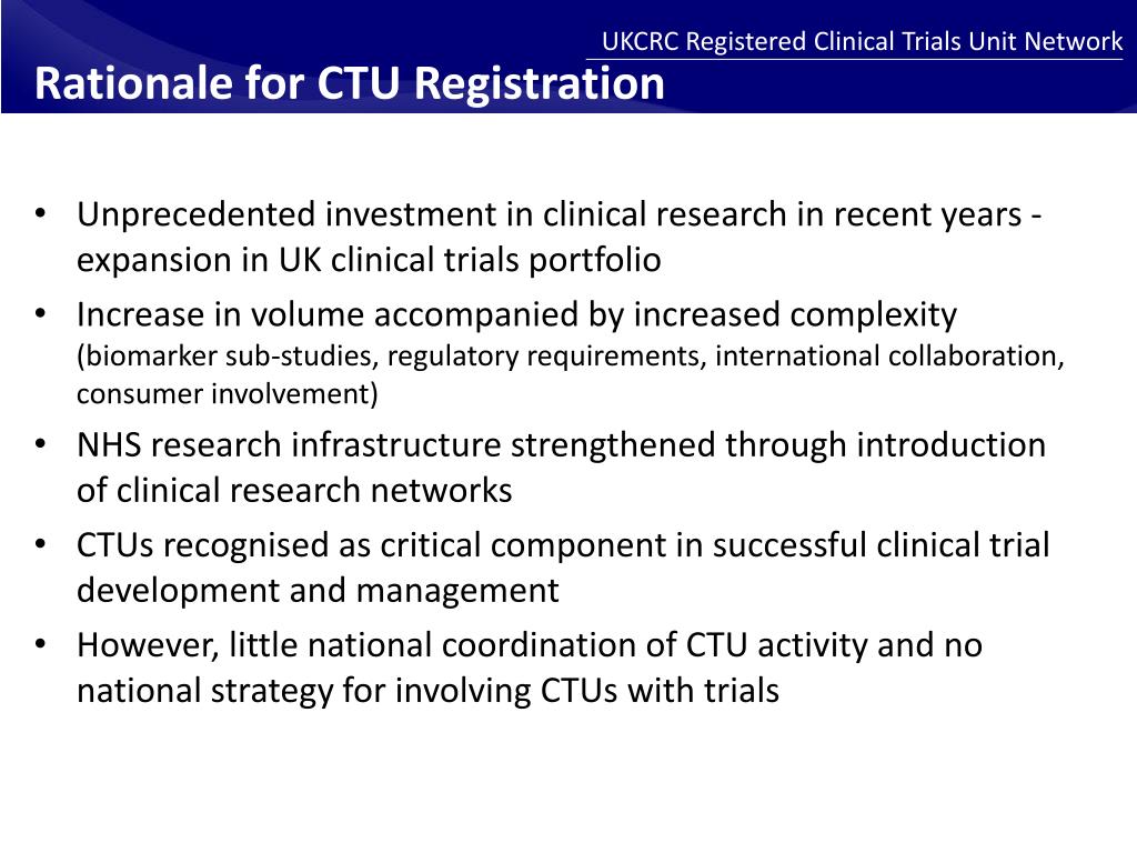 Unprecedented investment in clinical research in recent years - expansion in UK clinical trials portfolio Increase in volume accompanied by increased complexity (biomarker sub-studies, regulatory requirements, international collaboration, consumer involvement) NHS research infrastructure strengthened through introduction of clinical research networks CTUs recognised as critical component in successful clinical trial development and management However, little national coordination of CTU activity and no national strategy for involving CTUs with trials Rationale for CTU Registration