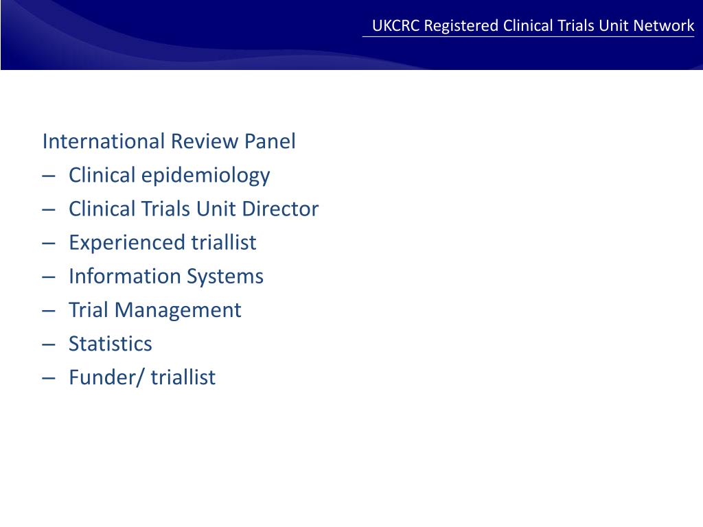 Two levels of registration offered: Full Track record in design, conduct and analysis Presence of core team of expert staff Robust QA systems Long term viability Provisional Developing expertise but currently falls short of full complement of infrastructure, resource and experience for full registration Facilitatory process – identifying CTUs with well established, high quality systems and outputs as well as those on the way to achieving this UKCRC Registration Process
