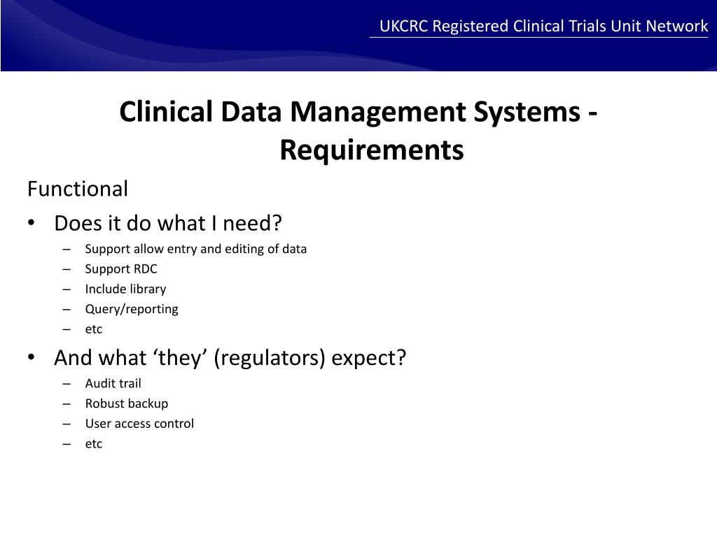 Clinical Data Management Systems - Requirements Functional • Does it do what I need? • Support allow entry and editing of data • Support RDC • Include library • Query/reporting • etc • And what ‘they’ (regulators) expect? • Audit trail • Robust backup • User access control • etc