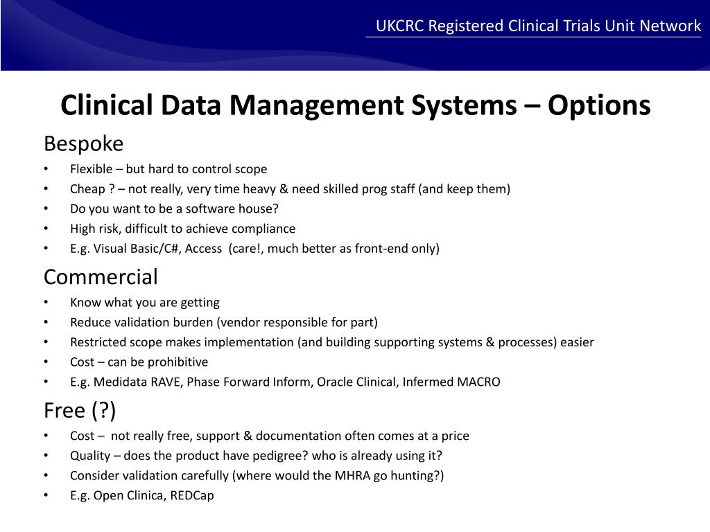Clinical Data Management Systems – Options Bespoke • Flexible – but hard to control scope • Cheap ? – not really, very time heavy & need skilled prog staff (and keep them) • Do you want to be a software house? • High risk, difficult to achieve compliance • E.g. Visual Basic/C#, Access (care!, much better as front-end only) Commercial • Know what you are getting • Reduce validation burden (vendor responsible for part) • Restricted scope makes implementation (and building supporting systems & processes) easier • Cost – can be prohibitive • E.g. Medidata RAVE, Phase Forward Inform, Oracle Clinical, Infermed MACRO Free (?) • Cost – not really free, support & documentation often comes at a price • Quality – does the product have pedigree? who is already using it? • Consider validation carefully (where would the MHRA go hunting?) • E.g. Open Clinica, REDCap