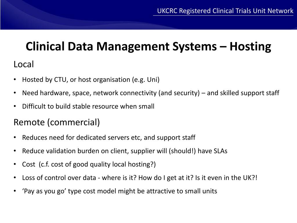 Clinical Data Management Systems – Hosting Local • Hosted by CTU, or host organisation (e.g. Uni) • Need hardware, space, network connectivity (and security) – and skilled support staff • Difficult to build stable resource when small Remote (commercial) • Reduces need for dedicated servers etc, and support staff • Reduce validation burden on client, supplier will (should!) have SLAs • Cost (c.f. cost of good quality local hosting?) • Loss of control over data - where is it? How do I get at it? Is it even in the UK?! • ‘Pay as you go’ type cost model might be attractive to small units