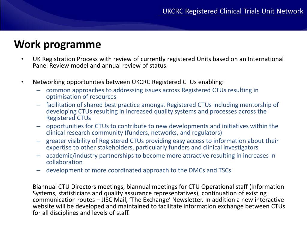 Work programme • UK Registration Process with review of currently registered Units based on an International Panel Review model and annual review of status. • Networking opportunities between UKCRC Registered CTUs enabling: • common approaches to addressing issues across Registered CTUs resulting in optimisation of resources • facilitation of shared best practice amongst Registered CTUs including mentorship of developing CTUs resulting in increased quality systems and processes across the Registered CTUs • opportunities for CTUs to contribute to new developments and initiatives within the clinical research community (funders, networks, and regulators) • greater visibility of Registered CTUs providing easy access to information about their expertise to other stakeholders, particularly funders and clinical investigators • academic/industry partnerships to become more attractive resulting in increases in collaboration • development of more coordinated approach to the DMCs and TSCs Biannual CTU Directors meetings, biannual meetings for CTU Operational staff (Information Systems, statisticians and quality assurance representatives), continuation of existing communication routes – JISC Mail, ‘The Exchange’ Newsletter. In addition a new interactive website will be developed and maintained to facilitate information exchange between CTUs for all disciplines and levels of staff.
