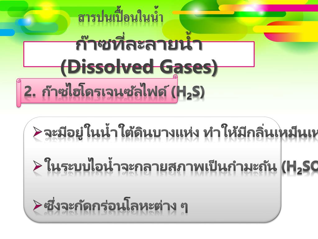 สารปนเปื้อนในน้ำ ก๊าซที่ละลายน้ำ (Dissolved Gases) ก๊าซไฮโดรเจนซัลไฟด์ (H2S) • จะมีอยู๋ในน้ำใต้ดินบางแห่ง ทำให้มีกลิ่นเหม็นเหมือนไข่เน่า • ในระบบไอน้ำจะกลายสภาพเป็นกำมะถัน (H2SO4) • ซึ่งจะกัดกร่อนโลหะต่าง ๆ