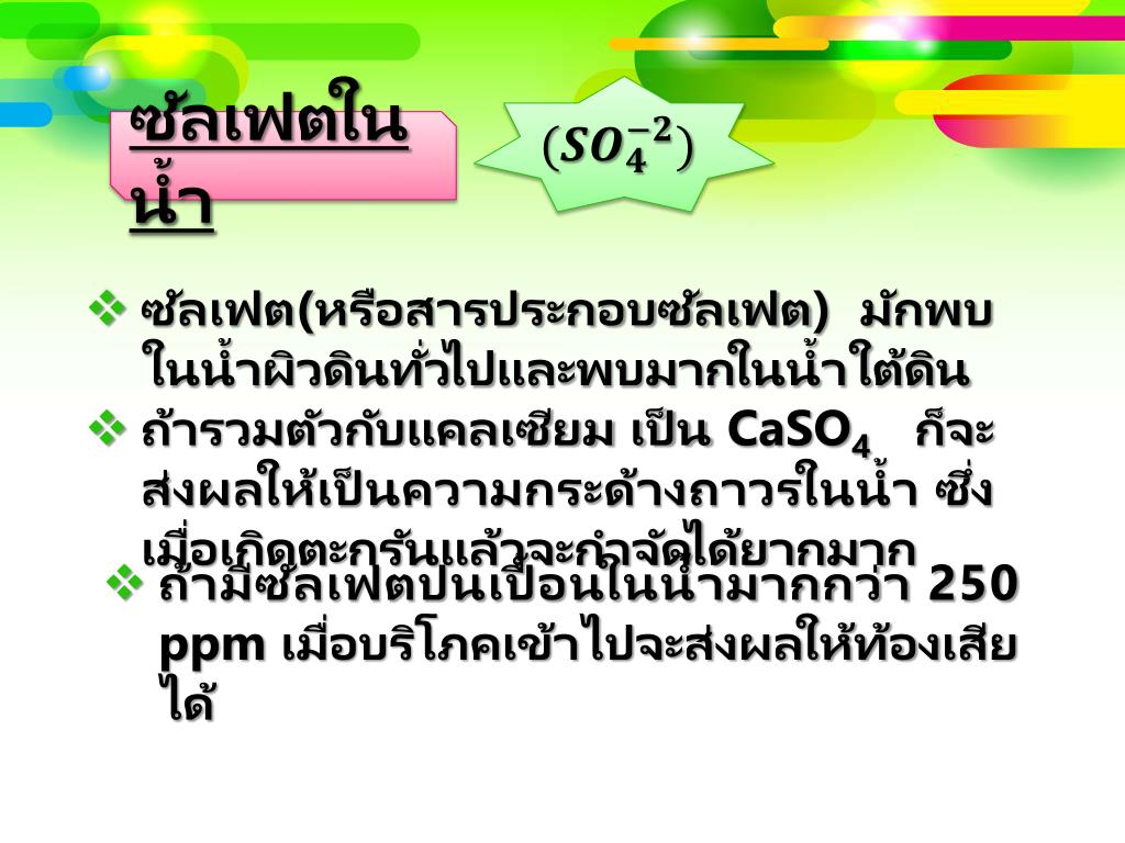 ซัลเฟตในน้ำ • ซัลเฟต(หรือสารประกอบซัลเฟต) มักพบในน้ำผิวดินทั่วไปและพบมากในน้ำใต้ดิน • ถ้ารวมตัวกับแคลเซียม เป็น CaSO4ก็จะส่งผลให้เป็นความกระด้างถาวรในน้ำ ซึ่งเมื่อเกิดตะกรันแล้วจะกำจัดได้ยากมาก • ถ้ามีซัลเฟตปนเปื้อนในน้ำมากกว่า 250 ppm เมื่อบริโภคเข้าไปจะส่งผลให้ท้องเสียได้