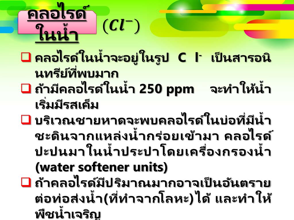 คลอไรด์ในน้ำ • คลอไรด์ในน้ำจะอยู่ในรูป C l-เป็นสารอนินทรีย์ที่พบมาก • ถ้ามีคลอไรด์ในน้ำ 250 ppm จะทำให้น้ำเริ่มมีรสเค็ม • บริเวณชายหาดจะพบคลอไรด์ในบ่อที่มีน้ำชะดินจากแหล่งน้ำกร่อยเข้ามา คลอไรด์ปะปนมาในน้ำประปาโดยเครื่องกรองน้ำ (water softener units) • ถ้าคลอไรด์มีปริมาณมากอาจเป็นอันตรายต่อท่อส่งน้ำ(ที่ทำจากโลหะ)ได้ และทำให้พืชน้ำเจริญ • ในทางการแพทย์ได้กำหนดว่าโภชนาการที่ดีนั้นจะต้องมีปริมาณเกลือโซเดียมคลอไรด์ต่ำ
