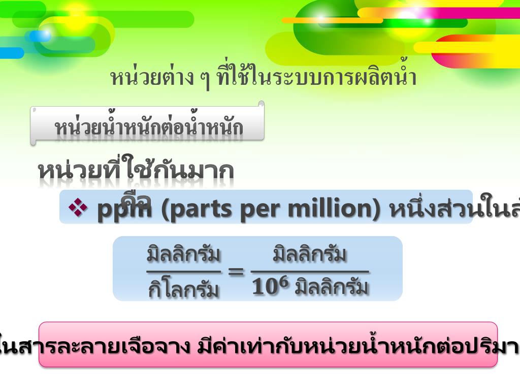 หน่วยต่าง ๆ ที่ใช้ในระบบการผลิตน้ำ หน่วยน้ำหนักต่อน้ำหนัก หน่วยที่ใช้กันมากคือ • ppm (parts per million) หนึ่งส่วนในล้านส่วน ในสารละลายเจือจาง มีค่าเท่ากับหน่วยน้ำหนักต่อปริมาตร