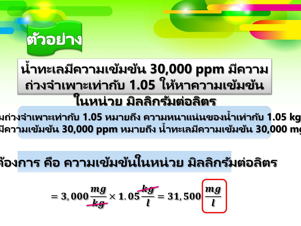 ตัวอย่าง น้ำทะเลมีความเข้มข้น 30,000 ppm มีความถ่วงจำเพาะเท่ากับ 1.05 ให้หาความเข้มข้นในหน่วย มิลลิกรัมต่อลิตร ความถ่วงจำเพาะเท่ากับ 1.05 หมายถึง ความหนาแน่นของน้ำเท่ากับ 1.05 kg/l น้ำทะเลมีความเข้มข้น 30,000 ppm หมายถึง น้ำทะเลมีความเข้มข้น 30,000 mg/kg สิ่งที่ต้องการ คือ ความเข้มข้นในหน่วย มิลลิกรัมต่อลิตร