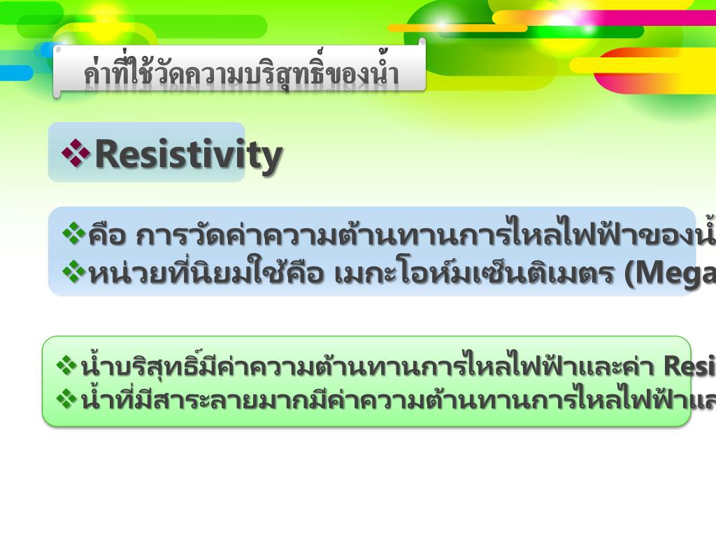 Resistivity ค่าที่ใช้วัดความบริสุทธิ์ของน้ำ • คือ การวัดค่าความต้านทานการไหลไฟฟ้าของน้ำ • หน่วยที่นิยมใช้คือ เมกะโอห์มเซ็นติเมตร (Megaohm-cm) • น้ำบริสุทธิ์มีค่าความต้านทานการไหลไฟฟ้าและค่า Resistivityสูง • น้ำที่มีสาระลายมากมีค่าความต้านทานการไหลไฟฟ้าและค่า ต่ำลง