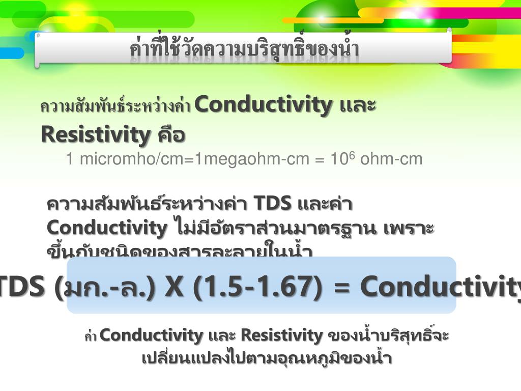 ค่าที่ใช้วัดความบริสุทธิ์ของน้ำค่าที่ใช้วัดความบริสุทธิ์ของน้ำ ความสัมพันธ์ระหว่างค่า Conductivity และ Resistivity คือ 1 micromho/cm=1megaohm-cm = 106 ohm-cm ความสัมพันธ์ระหว่างค่า TDS และค่า Conductivity ไม่มีอัตราส่วนมาตรฐาน เพราะขึ้นกับชนิดของสารละลายในน้ำ TDS (มก.-ล.) X (1.5-1.67) = Conductivity ค่า Conductivity และ Resistivity ของน้ำบริสุทธิ์จะเปลี่ยนแปลงไปตามอุณหภูมิของน้ำ