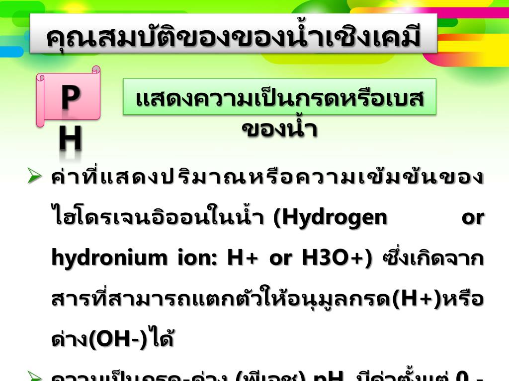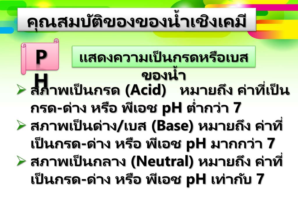 คุณสมบัติของของน้ำเชิงเคมีคุณสมบัติของของน้ำเชิงเคมี • pH แสดงความเป็นกรดหรือเบสของน้ำ • สภาพเป็นกรด (Acid) หมายถึง ค่าที่เป็นกรด-ด่าง หรือ พีเอช pH ต่ำกว่า 7 • สภาพเป็นด่าง/เบส (Base) หมายถึง ค่าที่เป็นกรด-ด่าง หรือ พีเอช pH มากกว่า 7 • สภาพเป็นกลาง (Neutral) หมายถึง ค่าที่เป็นกรด-ด่าง หรือ พีเอช pH เท่ากับ 7