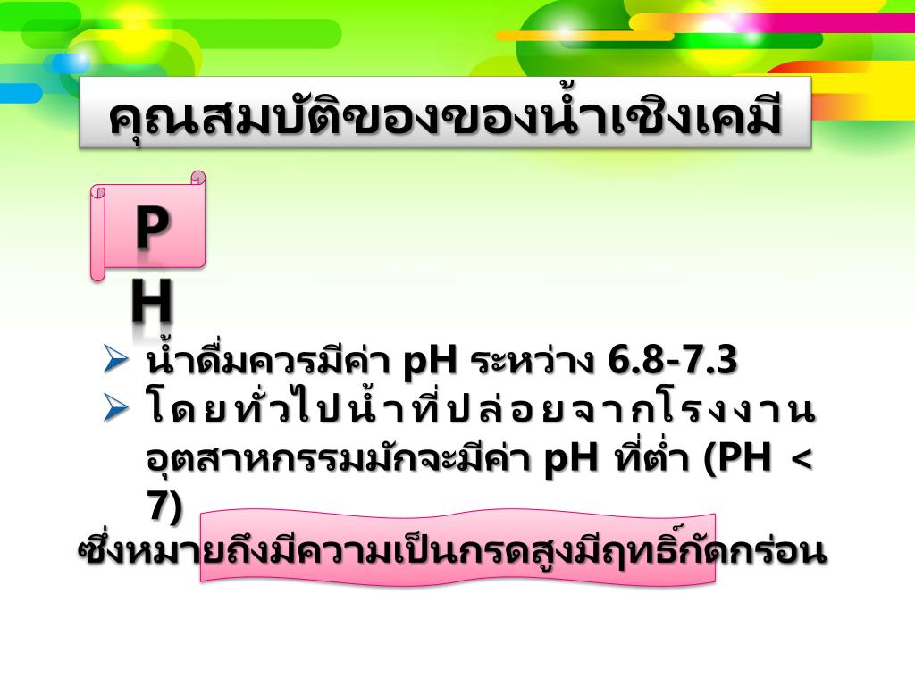คุณสมบัติของของน้ำเชิงเคมีคุณสมบัติของของน้ำเชิงเคมี • pH • น้ำดื่มควรมีค่า pH ระหว่าง 6.8-7.3 • โดยทั่วไปน้ำที่ปล่อยจากโรงงานอุตสาหกรรมมักจะมีค่า pH ที่ต่ำ (PH < 7) ซึ่งหมายถึงมีความเป็นกรดสูงมีฤทธิ์กัดกร่อน