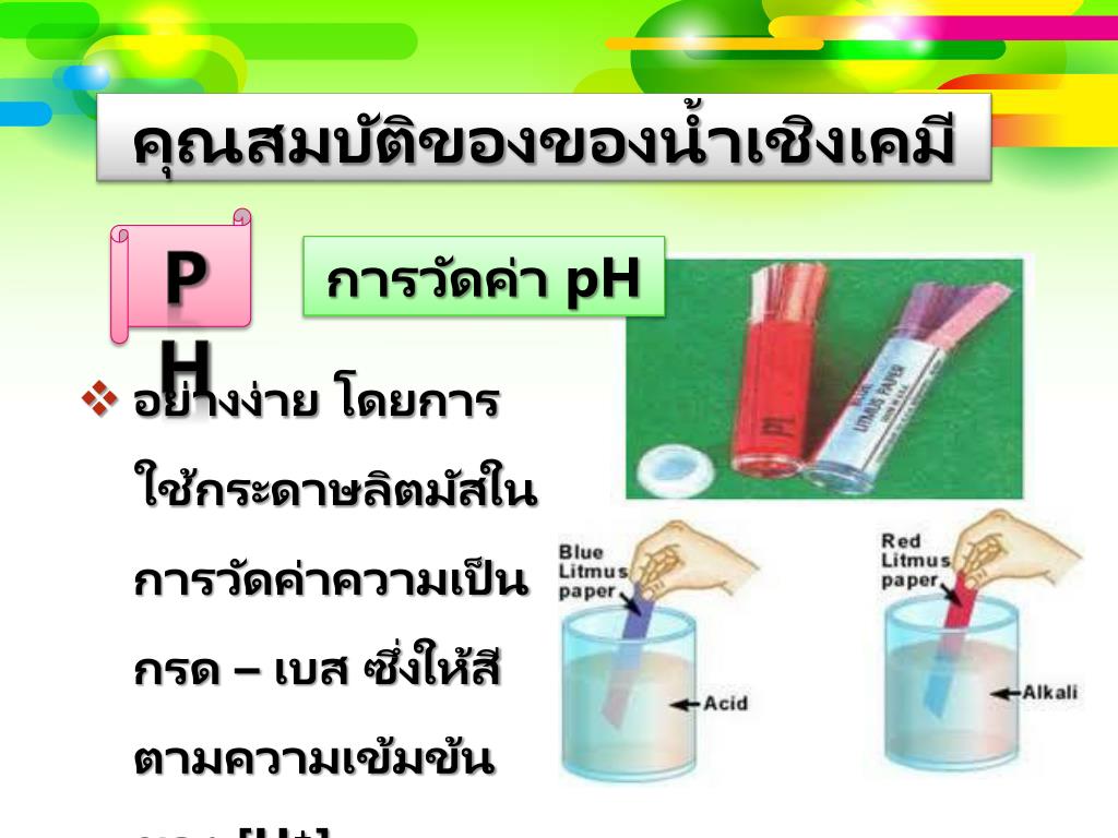 คุณสมบัติของของน้ำเชิงเคมีคุณสมบัติของของน้ำเชิงเคมี • pH การวัดค่า pH • อย่างง่าย โดยการใช้กระดาษลิตมัสในการวัดค่าความเป็นกรด – เบส ซึ่งให้สีตามความเข้มข้นของ [H+]
