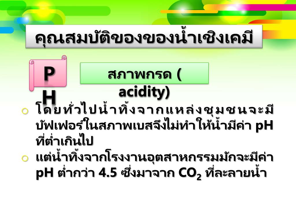 คุณสมบัติของของน้ำเชิงเคมีคุณสมบัติของของน้ำเชิงเคมี • pH สภาพกรด ( acidity) • โดยทั่วไปน้ำทิ้งจากแหล่งชุมชนจะมีบัฟเฟอร์ในสภาพเบสจึงไม่ทำให้น้ำมีค่า pH ที่ต่ำเกินไป • แต่น้ำทิ้งจากโรงงานอุตสาหกรรมมักจะมีค่า pH ต่ำกว่า 4.5 ซึ่งมาจาก CO2ที่ละลายน้ำ